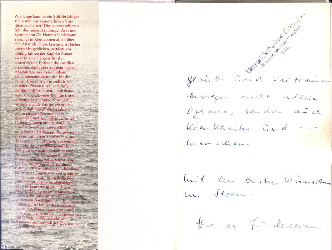 aufgrund seiner Veröffentlichungen als Autor. In seinem Buch „Allein über den Ozean“ gibt Lindemann sein „Tagebuch“ über das Abenteuer seiner ersten Fahrten wieder.