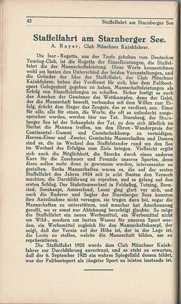 Die Staffelfahrt 1925 wurde dem Club Münchner Kajakfahrer zur Durchführung anvertraut, und es steht zu erwarten, daß der 6. September 1925 ein wahres Spiegelbild dessen bildet, was der Faltbootsport als jüngster Sport zu leisten imstande ist.