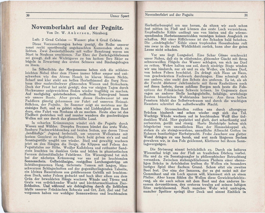 Im Silberlichte der Morgensonne heben sich die schleierleichten Nebel über dem Flusse immer höher empor und entschweben wie des Atems Hauch im klaren blauen Nichts. Scharf und klar steht am hellen Herbsthimmel die Burg Neuhaus über rauhreifschwer glänzenden Wiesen und Sträuchern. Doch der Frost hat nicht genügt, den vor einigen Tagen durch Hochwasser aufgeweichten Boden wieder tragfähig zu machen. Auf nachgiebig quietschendem, naßkaltem Untergrund bauen wir unsere Boote. Aber gerade dieses Hochwasser ist uns Paddlern günstig gekommen zur Fahrt auf unserem Heimatflüßchen, der Pegnitz. Im Sommer zeigt sie meistens nur ihr steiniges Bett, und es gehört schon viel Lieblosigkeit zum Boot dazu, eine Fahrt von Neuhaus ab zu machen. Heute aber ist das Flußbett gestrichen voll und munter wandern die geschwätzigen Wellen mit uns durch das glanzerfüllte Land.“