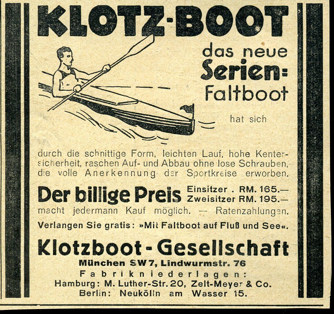 Klotz-Boot ist erwähnt im Faltbootspiegel von 1928/29 und belegbar bis 1931.