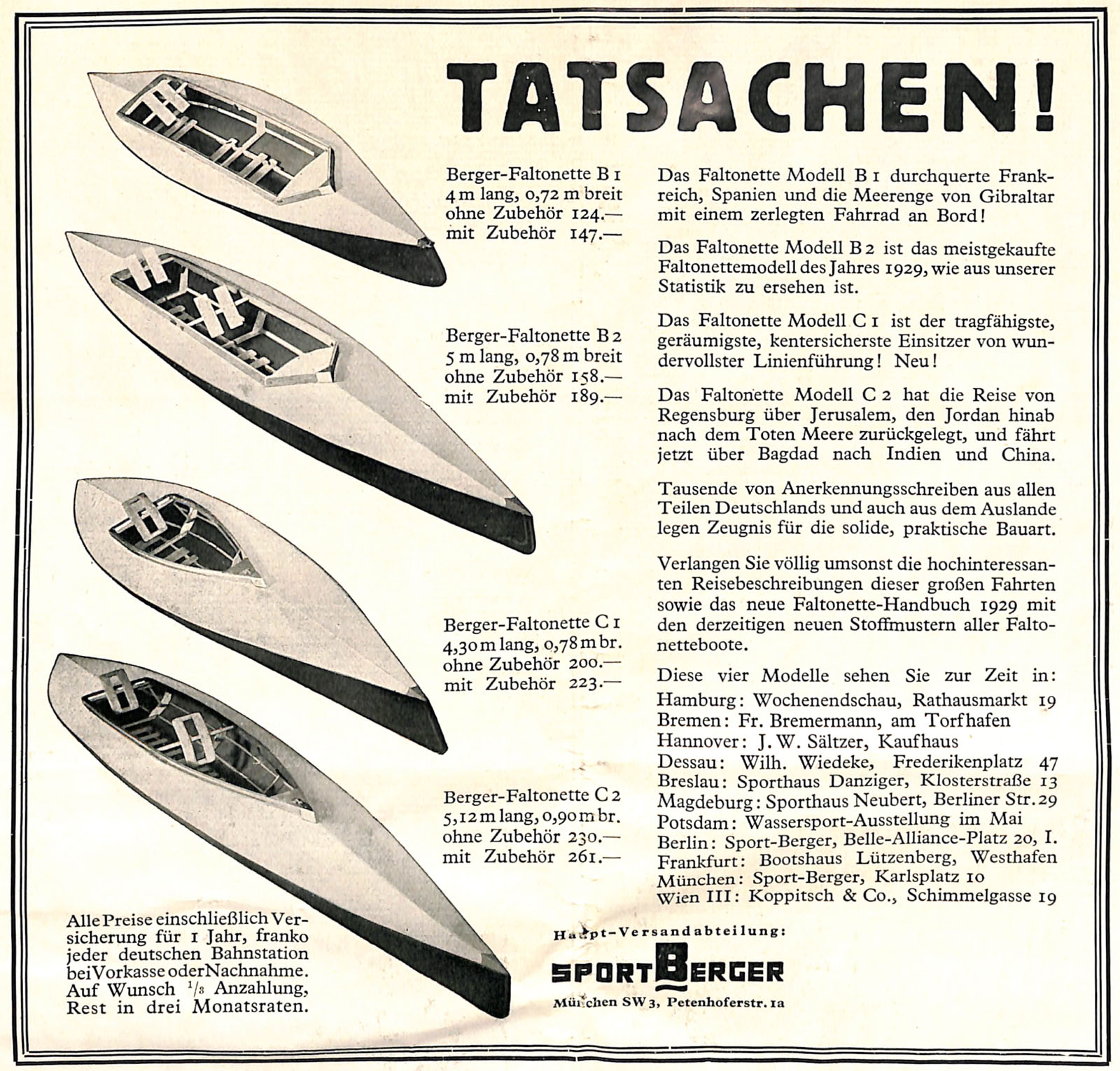 Die Firma verkaufte nicht nur Faltboote aus eigener Herstellung, sondern auch anderer Hersteller (Klepper, L.F.B., Bafawe, Steiner, Pionier und Lindner) und warb in seinen Verkaufsanzeigen schon 1925 damit, dass „jedes Faltboot auf Teilzahlung“ erworben werden kann. Für die Interessenten war das in den finanziell schwierigen Zeiten ein echter Anreiz.