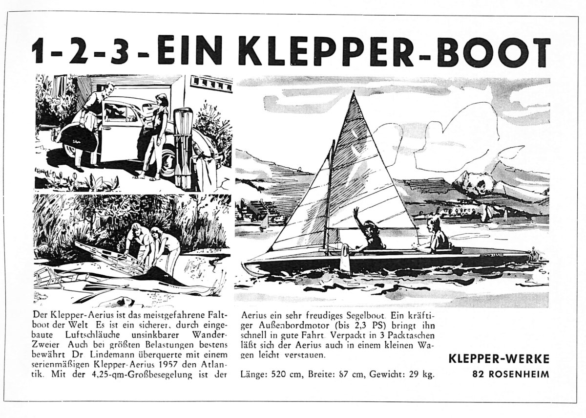 Aerius auf den Markt. Das Boot zeichnete sich durch eine absolute Neuheit aus: zwei seitlich eingearbeitete Luftschläuche. Diese machen das Boot auch heute noch unsinkbar und im Handling weitgehend kentersicher. Innerhalb kürzester Zeit entwickelte sich der Aerius zum bestverkauften Klepper-Boot des Programms und wird auch heute noch in verbesserter Form gebaut.