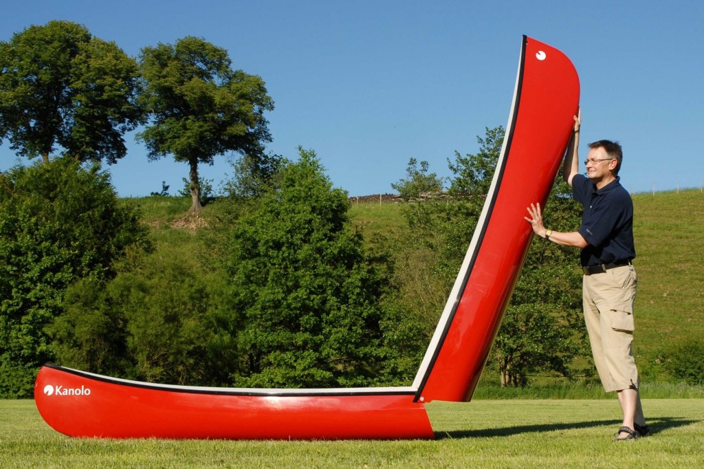 Der Kanolo Klapp-Canadier war ein zusammenklappbares und dank seines Hartschalen-Rumpfes ein vollwertiges Sportgerät für bis zu zwei Erwachsene und zwei Kinder. In einer Minute war das praktische Gefährt auf die Hälfte seiner Länge in der Mitte zusammengeklappt.